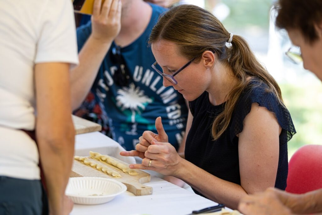 This year, the vendors offered 28 different servings, which added variety to the traditional taste of Idrija žlikrofi. In addition to the established versions with bakalca (mutton stew), goulash, and pork cracklings, this year’s offerings were particularly diverse. Both the taste and the eyes were delighted by colorful žlikrofi with truffles, hazelnuts, and Parmesan, reviving almost forgotten traditions with rabbit in sauce, and positively surprising with Idrija žlikrofi prepared in a Pad Thai style. There were also žlikrofi for vegans, vegetarians, and those without gluten, as well as žlikrofi with a filling of sour turnip or žlikrofi made from buckwheat flour.